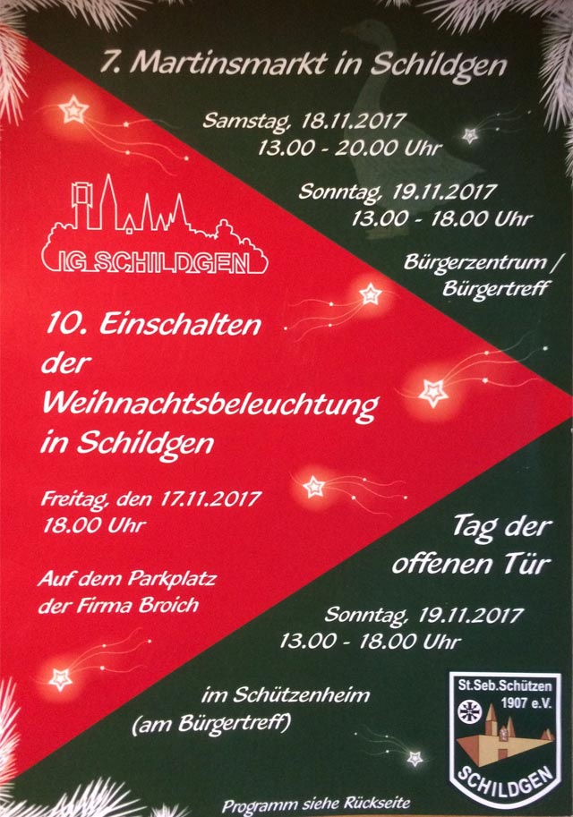 Traditionell gibt es ausgeschenkt von den Schildgener Schützen Glühwein und antialkoholische Getränke – für das leibliche Wohl sorgt die KG Blau-Rot Schildgen – Weckmänner für die Kinder sind gestiftet von Cafe Pieper. Eine Hüpfburg ist aufgebaut, Zauberer und Feuerspucker kommen auch zu Besuch. Ab 18:30 gibt´s Livemusik vom Posaunenchor.