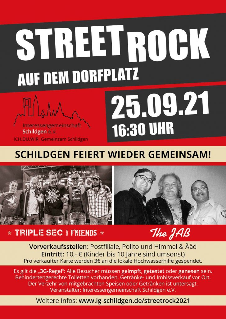 Am 25. September 2021 wollen wir endlich wieder – natürlich unter Einhaltung der geltenden Hygieneregeln – gemeinsam in Schildgen feiern. Nach zwei ausgefallenen Dorffesten ist es an der Zeit, wieder mit Nachbarn, Freunden und der Familie zusammen einen schönen und entspannten Tag zu verbringen. Dazu lädt die IG Schildgen ganz herzlich zum Street Rock auf dem Dorfplatz hinter die Herz-Jesu-Kirche ein.
